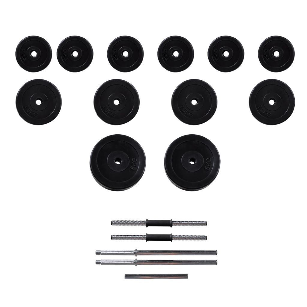 This set of barbell/dumbbell with weight discs will allow you to perform a large range of exercises more easily and safely at home or in the gym. This ergonomically designed set includes 1 barbell; 2 dumbbells; and 12 weight discs with a total weight of 67.2 pounds including the bars.