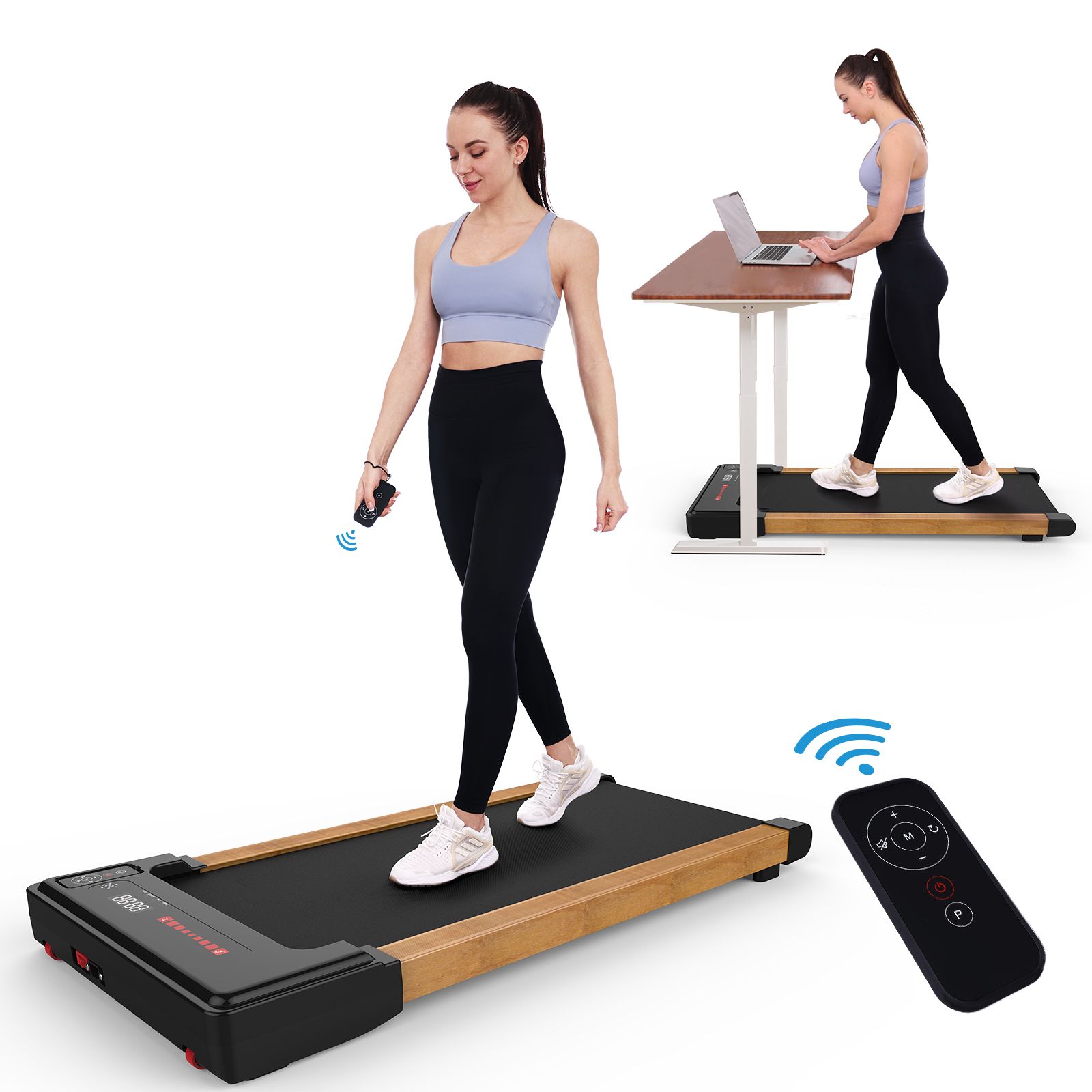 3.Ultra Light Design & Space Save: The OBENSKY mini treadmill for standing desk weighs 48 pounds and is 4.3 inches thick, whether you're in your office or apartment, you'll always find a right place to store it. Also the wheels on the front help you move and place it under sofa, corner or bed to save your home space. Max weight capacity: 265lbs.